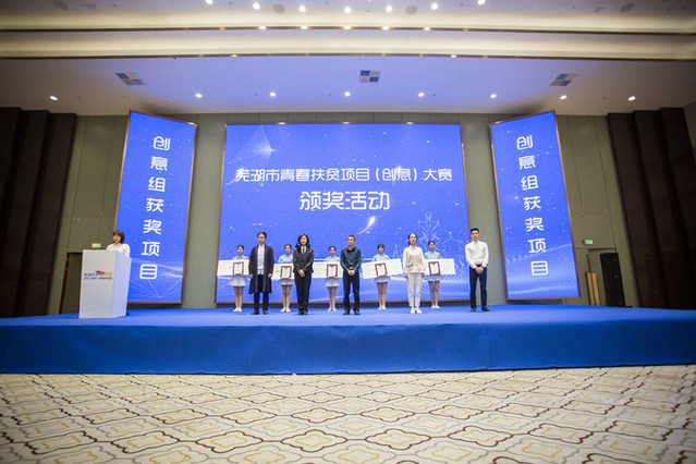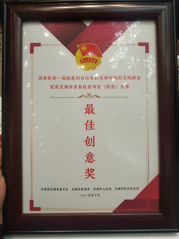 10月29日上午,由共青团芜湖市委联合芜湖市扶贫办、市人社局、市农业农村局共同举办的“芜湖市青春扶贫项目(创意)大赛颁奖活动”在芜湖苏宁环球大酒店举行。芜湖市市委副秘书长张敏、国家物联网基础标准工作组总体组组长沈杰及团市委、市扶贫办等举办单位相关负责人出席了本次活动。我院“含笑花”志愿者团队的《筑梦扶贫—高校废旧自行车回收再利用的实践探索》项目以第一名的好成绩荣获大赛创意组最佳创意奖。