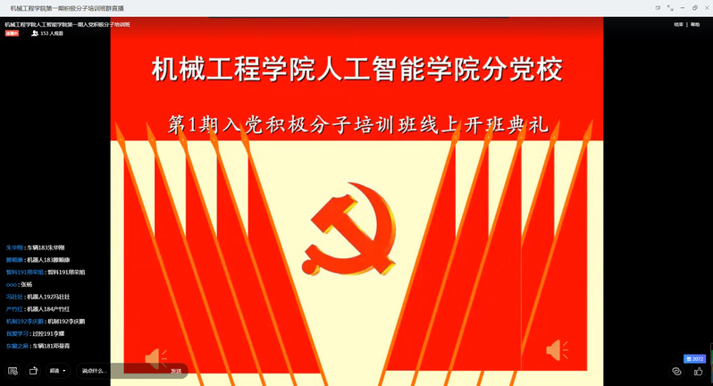 11月12日晚18:00,机械工程学院(人工智能学院)分党校第1期入党积极分子培训班开班典礼在线上隆重举行。院党委书记、院分党校校长伊长文出席典礼并讲话,院党委副书记李文江、何志恒,培训班班主任姚伟波、余玲艳及培训班全体学员参加了本次典礼。典礼由姚伟波老师主持。