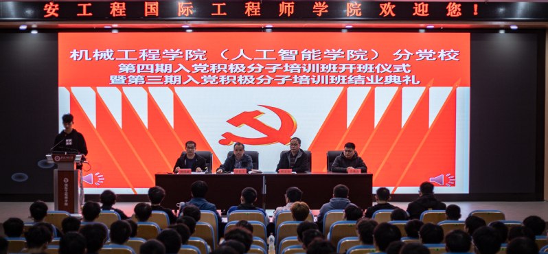 为贯彻落实党员教育管理工作的要求,切实加强入党积极分子的培养教育,确保党员发展质量,进一步提高党员素质。机械工程学院(人工智能学院)分党校第四期入党积极分子培训班开班仪式暨第三期入党积极分子培训班结业典礼于10月27日在国际工程师学院大报告厅举行。学院党委书记伊长文、党委副书记何志恒、分党校培训班班主任姚伟波老师、许典舟老师出席,全体培训班学员以及第三期培训班优秀学员代表参加了本次开班仪式。开班仪式由院党委副书记何志恒主持。