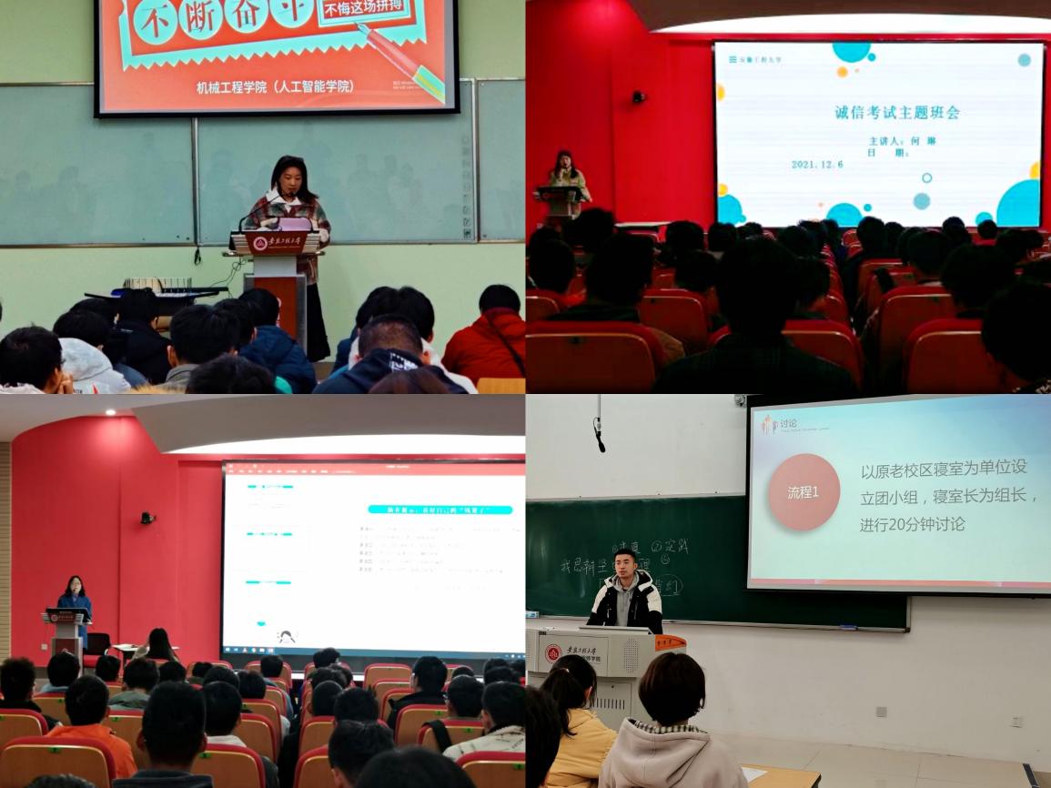 期末考试与研究生考试将至,机械工程学院(人工智能学院)全体辅导员结合各年级工作实际顺利完成12月份主题班会,重点围绕党史学习教育、诚信考试教育、毕业生考研就业指导、疫情防控与安全教育等主题开展教育宣传。
