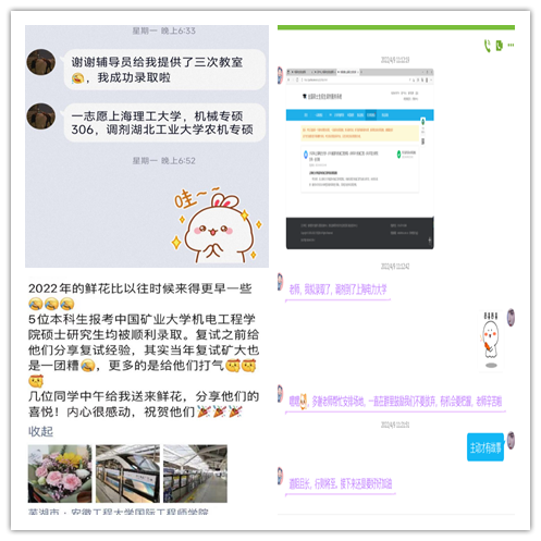 从学业困难到考研一志愿上岸,从得知未达线的迷茫到调剂成功的喜悦,学生们向老师表达着自己最真挚的感谢。“谢谢您在复试期间的帮助与指导”、“如果不是您在QQ群里一直发信息鼓励我们,我可能就放弃了”、“谢谢您曾经督促我学习,我才能及时醒悟,成功上岸”。学生们用最朴实的语言表达着最真挚的情感,老师的无私奉献与学生的感恩之心交织,谱写了“研途”最美的篇章。