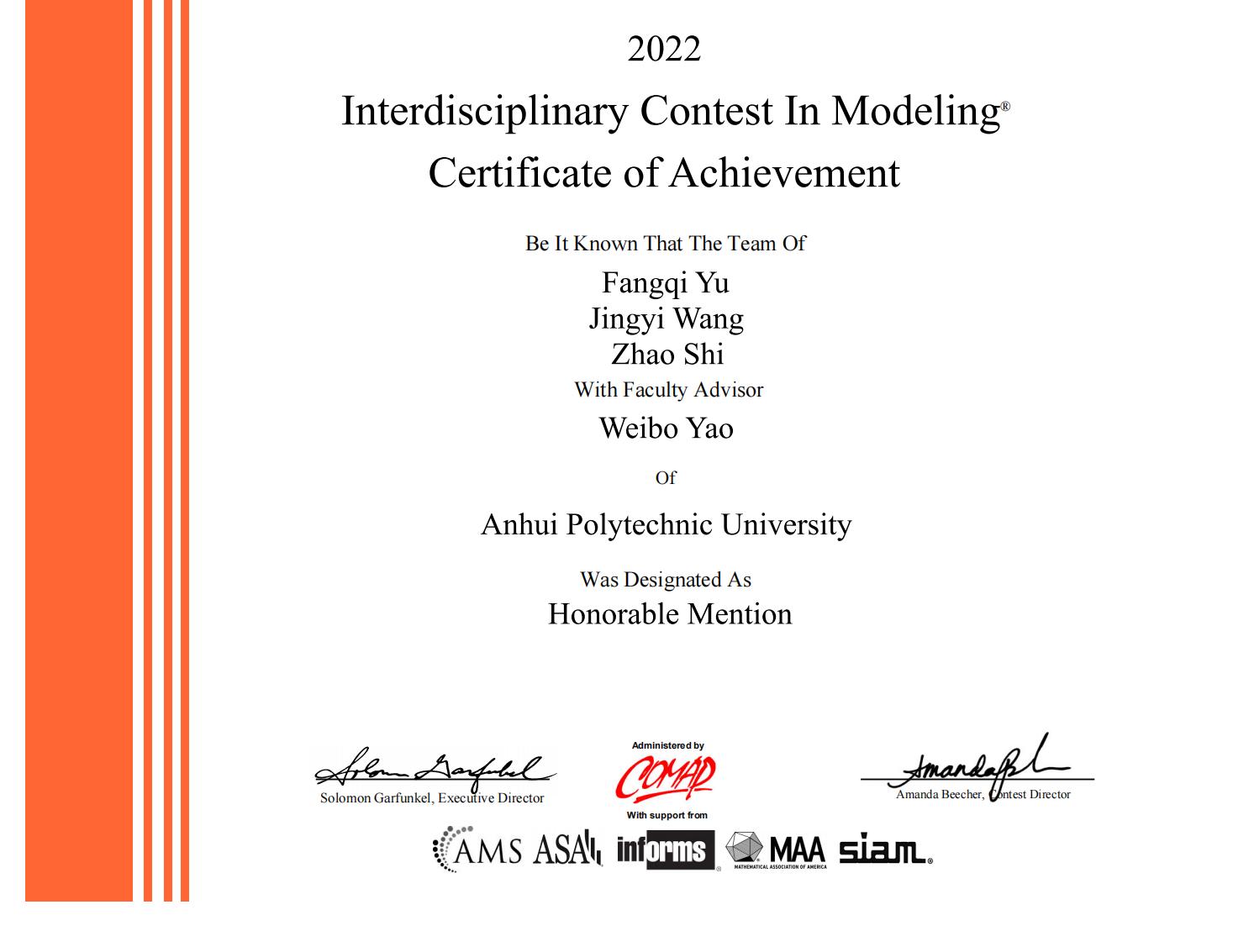 近日,2022年美国大学生数学建模竞赛获奖名单公布,共有27205支队伍参赛。美国大学生数学建模竞赛(MCM/ICM)由美国数学及其应用联合会主办,是唯一的国际性数学建模竞赛,也是世界范围内最具影响力的数学建模竞赛。机械工程学院(人工智能学院)第一期菁英班共组织8队参加竞赛,获二等奖3项,具体获奖名单如下。