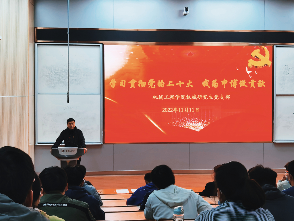 为学习宣传贯彻党的二十大精神,进一步激励学院研究生为学校博士立项单位建设贡献力量,11月11日,机械工程学院研究生四个党支部联合学习研讨会在2J报告厅举行,机械工程学院院长王建平和研究生全体党员参加研讨会。会议由机械研第一党支部书记程雷主持。