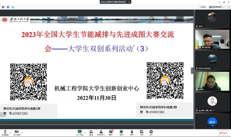 11月30日晚上,机械工程学院通过腾讯会议召开2023年全国大学生节能减排与先进成图大赛交流会。学院副院长王建彬、大学生双创中心主任钟相强、教师崔珍珍、2020级、2021级和2022级部分学生参加。活动由钟相强主持。