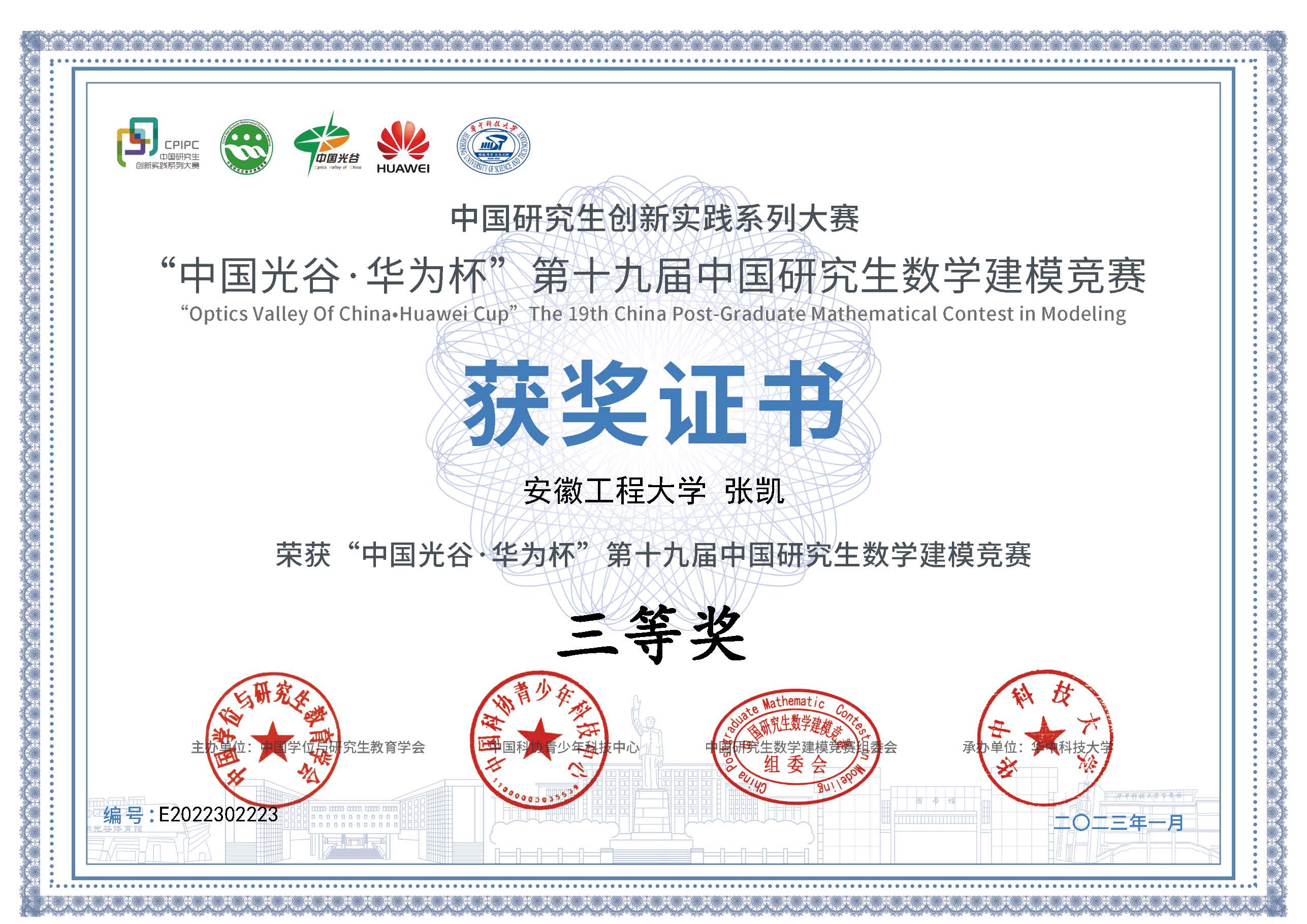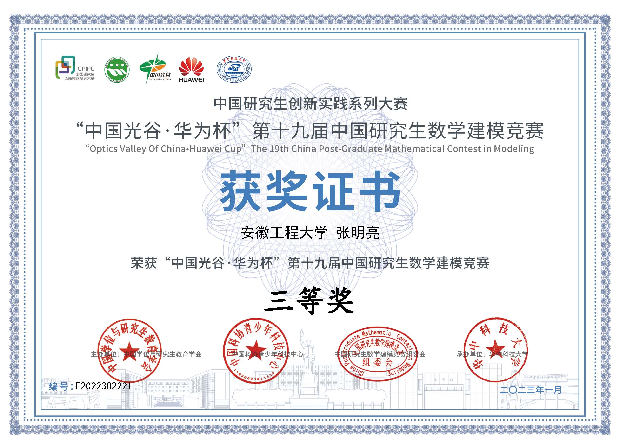 近日,第十九届中国研究生数学建模竞赛获奖名单公布,机械工程学院研究生2021级张明亮、2022级柳浩和张凯组成的队伍荣获全国三等奖。三名研究生在导师潘道远老师的指导下,利用四天时间完成了文献查阅、建模分析、算法设计、程序设计、论文撰写等全部工作,高质量完成参赛作品。