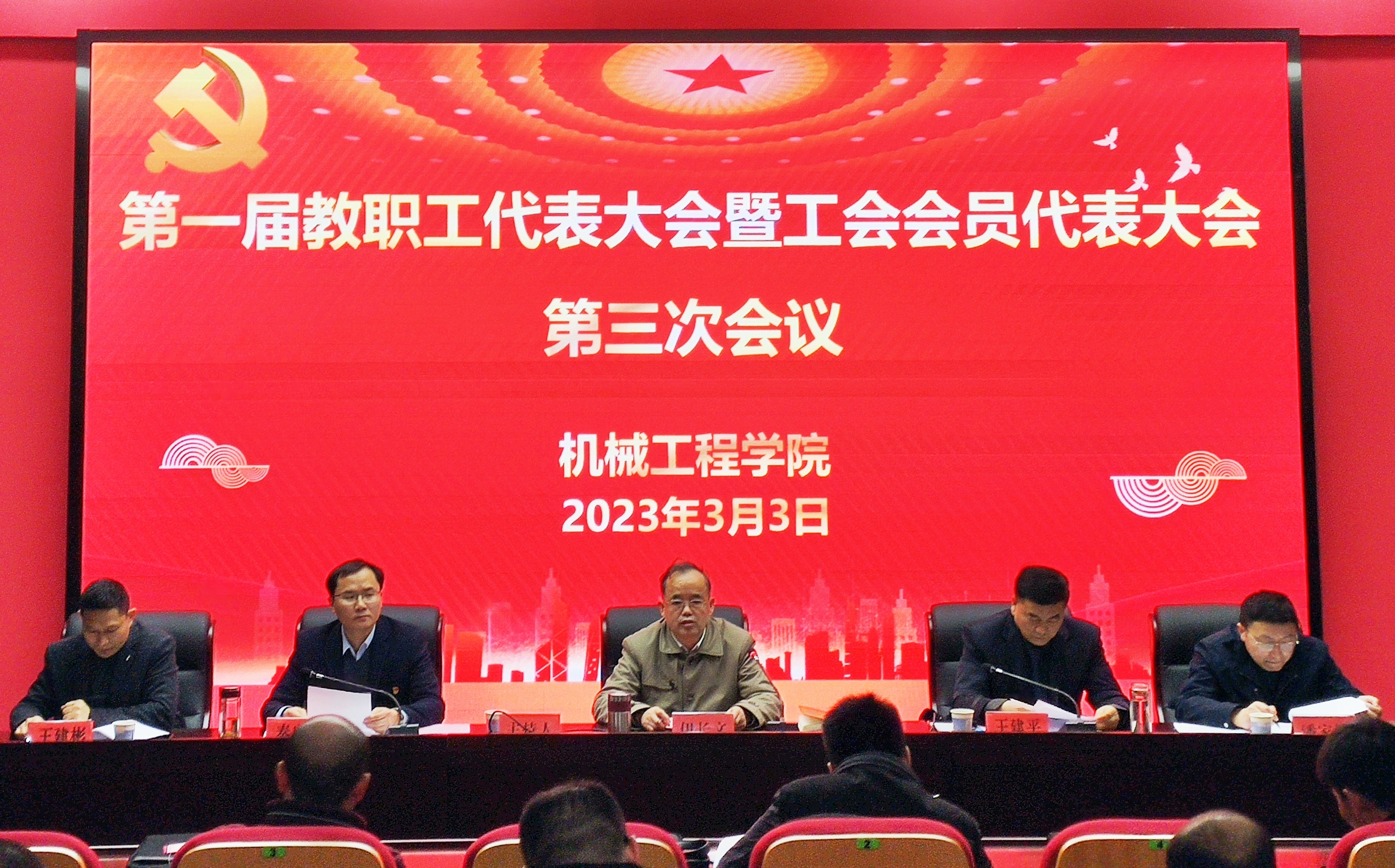 3月3日下午,机械工程学院第一届教代会暨工代会第三次会议在国际工程师学院小报告厅召开,学院党政领导和“两代会”代表参加会议。大会的预备会议和第一阶段会议由学院党委书记伊长文主持,第二阶段会议由院长王建平主持。