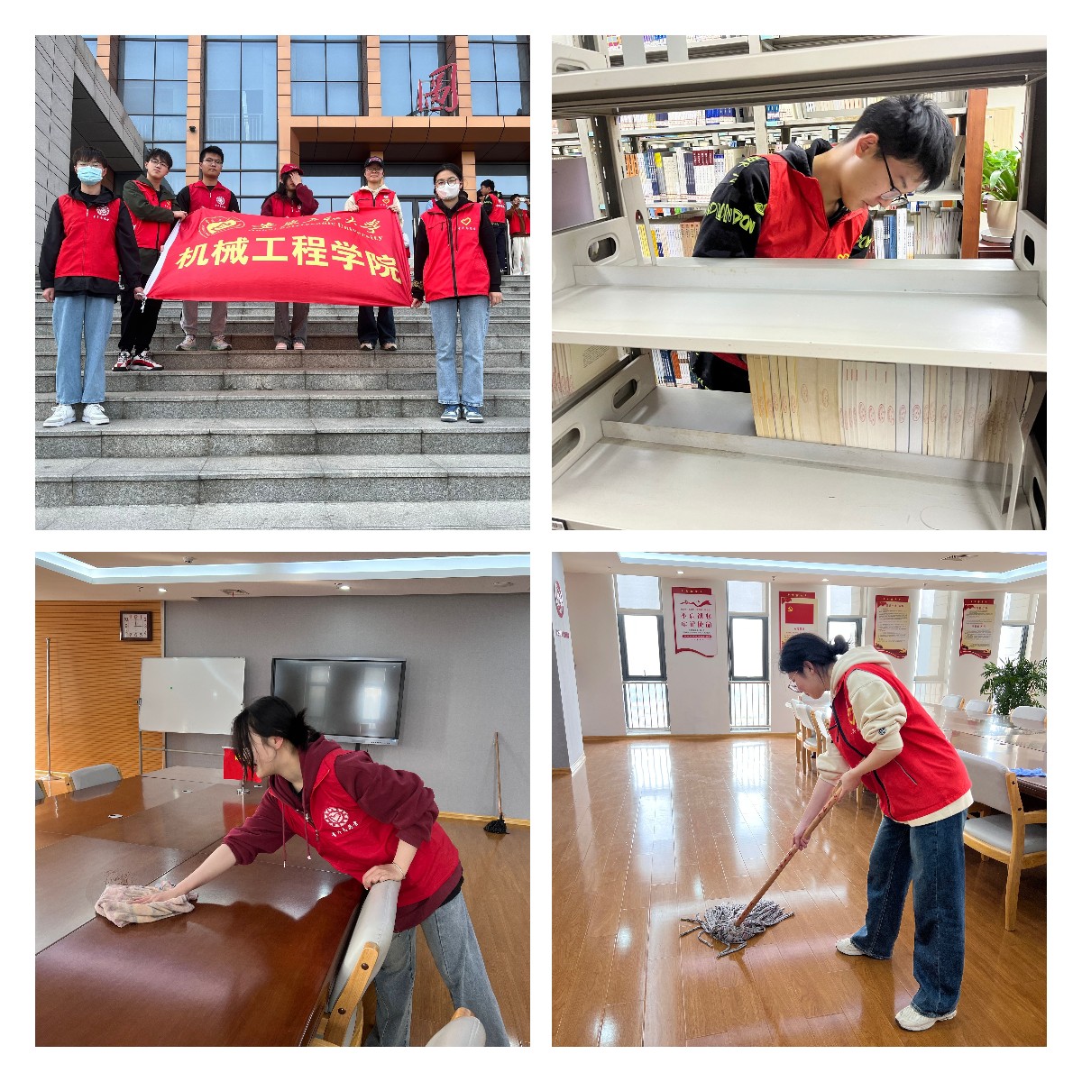 木槿花——守护和谐校园。志愿者们两次走进校本部图书馆,协助工作人员开展打扫卫生、整理书籍、清洁教室和会议室等工作,旨在为同学们提供一个良好的学习和交流的环境,用实际行动为同学办实事、办好事。