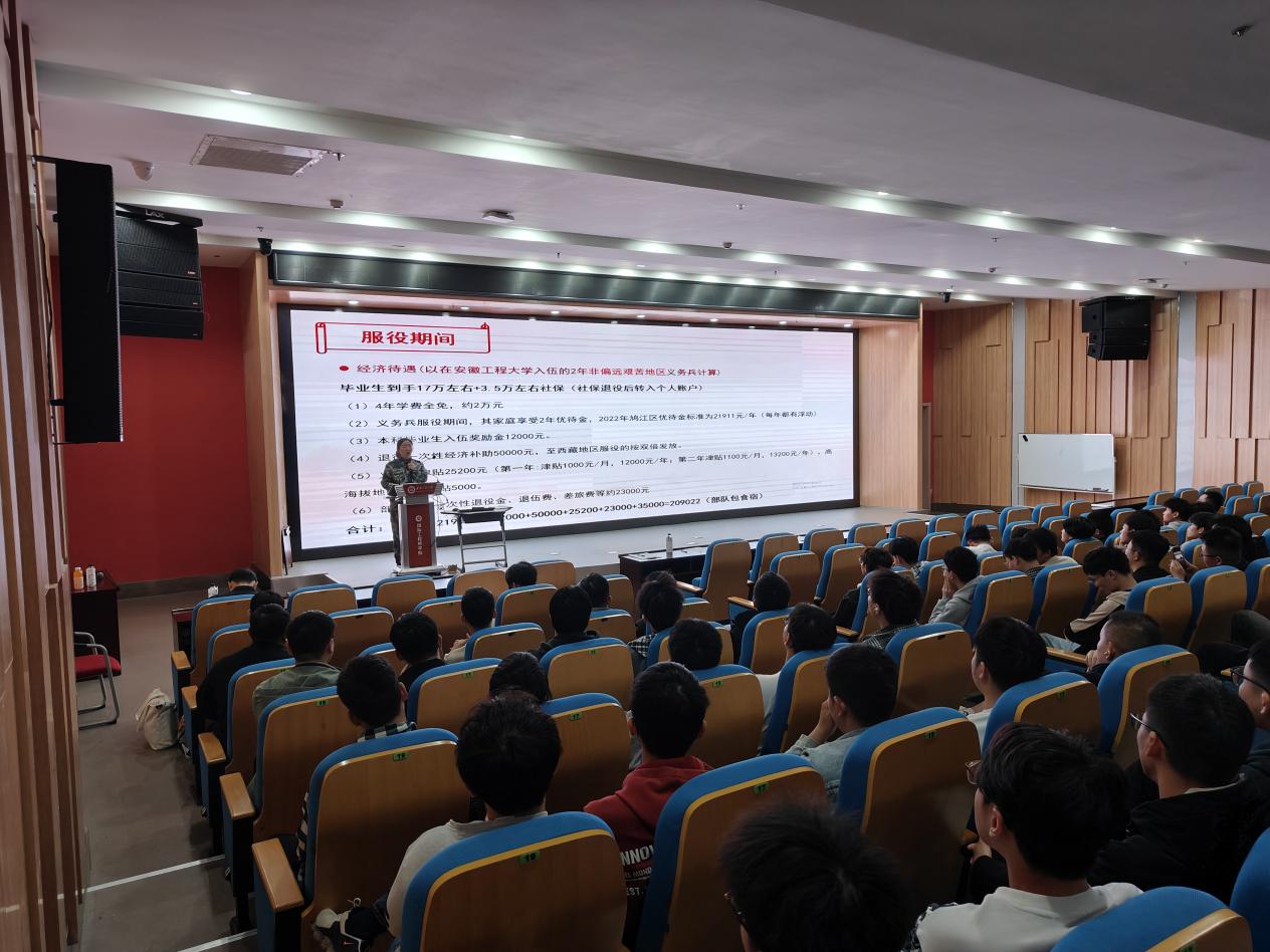 为切实做好2023年下半年征兵工作,激发广大学子投身军营、献身国防的爱国热情,鼓励和引导在校大学生积极应征入伍,4月14日,机械工程学院联合校征兵工作站对学院毕业班学子进行征兵动员。机械工程学院党委副书记秦广虎,校征兵工作站赵成婧老师,我院优秀退伍军人机制196汤鹏程同学,毕业年级辅导员和毕业班学生出席了本次活动。