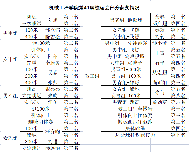 4月12日至14日,学校举行第四十一届运动会,我院积极响应学校号召,组织全院师生参加。经过三天的激烈角逐,最终夺得7枚金牌、12枚银牌、8枚铜牌,取得学生乙组团体冠军、学生甲组团体第四名、教工组团体第四名的好成绩!
