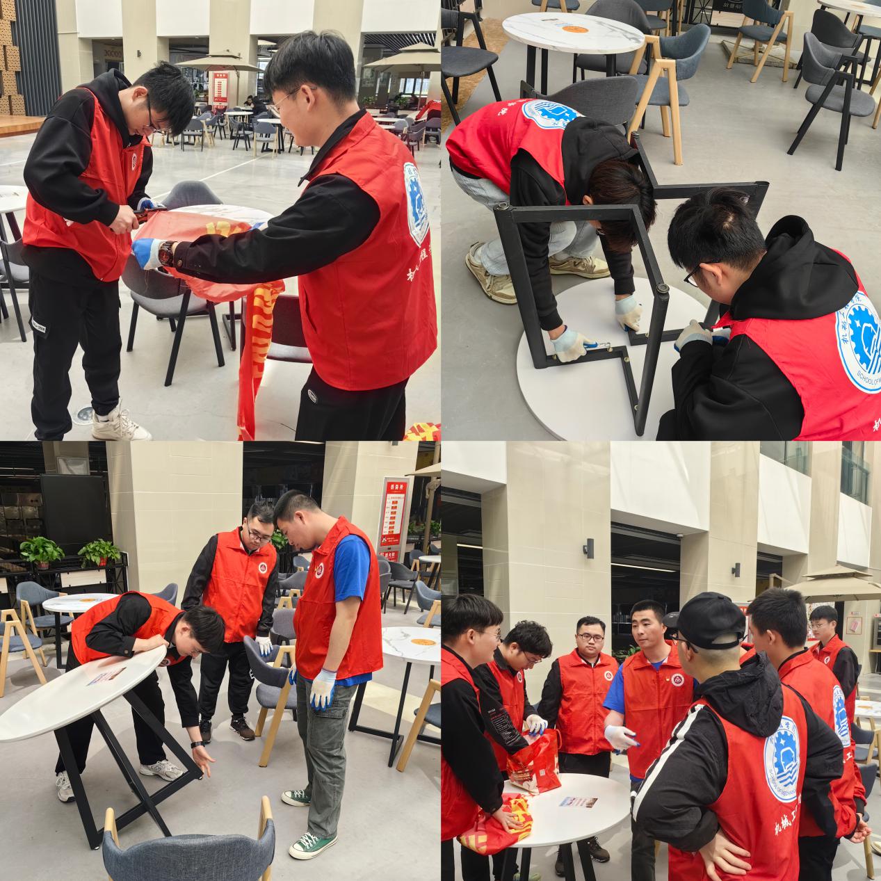活动开始后,支部党员分小组一一检查南苑餐厅中庭桌椅是否完好,针对存在晃动情况的桌椅,支部党员认真商讨,结合实际情况与专业所学,制定好详细具体的维修方案,确定问题、拧紧螺丝、反复检查,直至桌椅平稳。维修结束后,全体党员还主动协助餐厅工作人员清洁桌面卫生,为新校区全体师生营造了一个良好的就餐环境。据悉,本次活动累积检修桌椅三十余张,期间还得到了餐厅工作人员的高度赞扬。