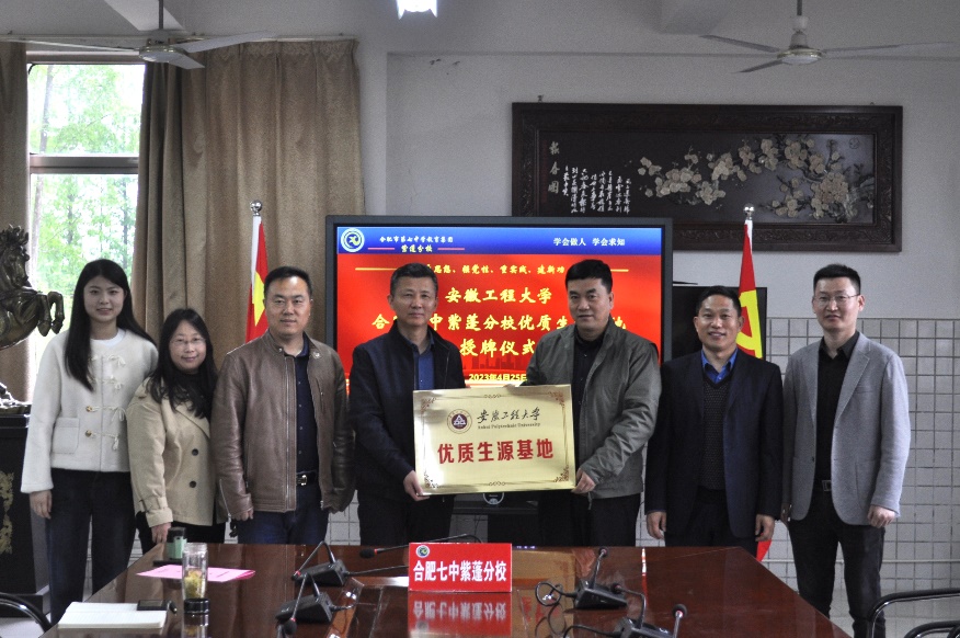 与高中的交流合作,4月26日,机械工程学院院长王建平、副院长王建彬、系主任、辅导员等一行赴合肥市肥西县开展招生宣传,与肥西中学、合肥七中紫蓬分校等两所省示范高中签订了优质生源基地协议并授牌。