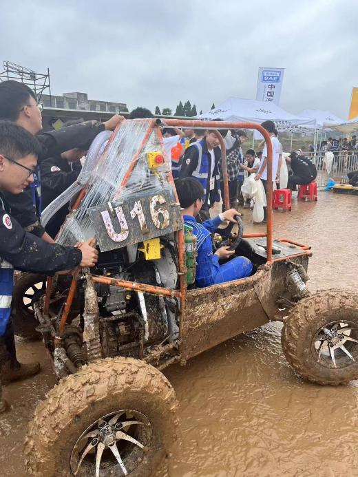 中国汽车工程学会巴哈大赛是由中国汽车工程学会主办,竞赛包括多种静态与动态项目测试。其中,静态项目包括技术检查、赛车设计、成本与制造、商业营销等,动态项目包括牵引力测试、操控性测试、耐力测试等。大赛是以培养高素质技术技能人才为核心的竞赛平台,致力于为汽车产业输送更多复合型人才,促进汽车运动文化产业的蓬勃发展。2023年4月,同学们在接到赛事通知后,几乎每晚都在车队工作室鏖战到凌晨,成功解决了赛车在制动、悬架以及转向方面存在的不足,让赛车能够以最佳的状态迎接比赛。本次赛事的动态项目均在黄土地质举行,加之连日阴雨,赛道内的淤泥深度一度超过100mm,赛车行进难度大大增加,对车手的体能消耗、赛车的可靠性和通过性以及参赛队员们的意志品质都是一次严峻的考验。比赛结束,车队成员返校后又立即投入到了2023年度巴哈大赛赛车设计制造和改良的紧张任务中。