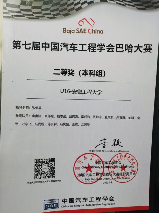 5月23日至28日,第七届中国汽车工程学会巴哈大赛在湖北省襄阳市举行,来自全国高校的97支队伍近2000人参赛。经过激烈的角逐,安徽工程大学“雷电车队”荣获二等奖。