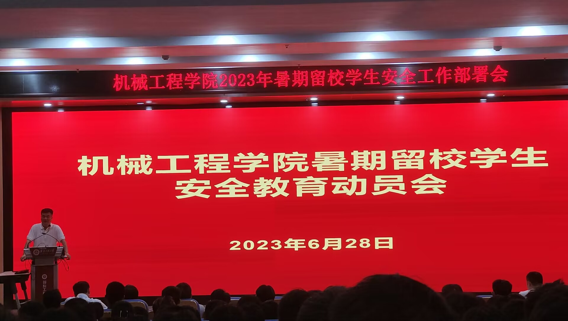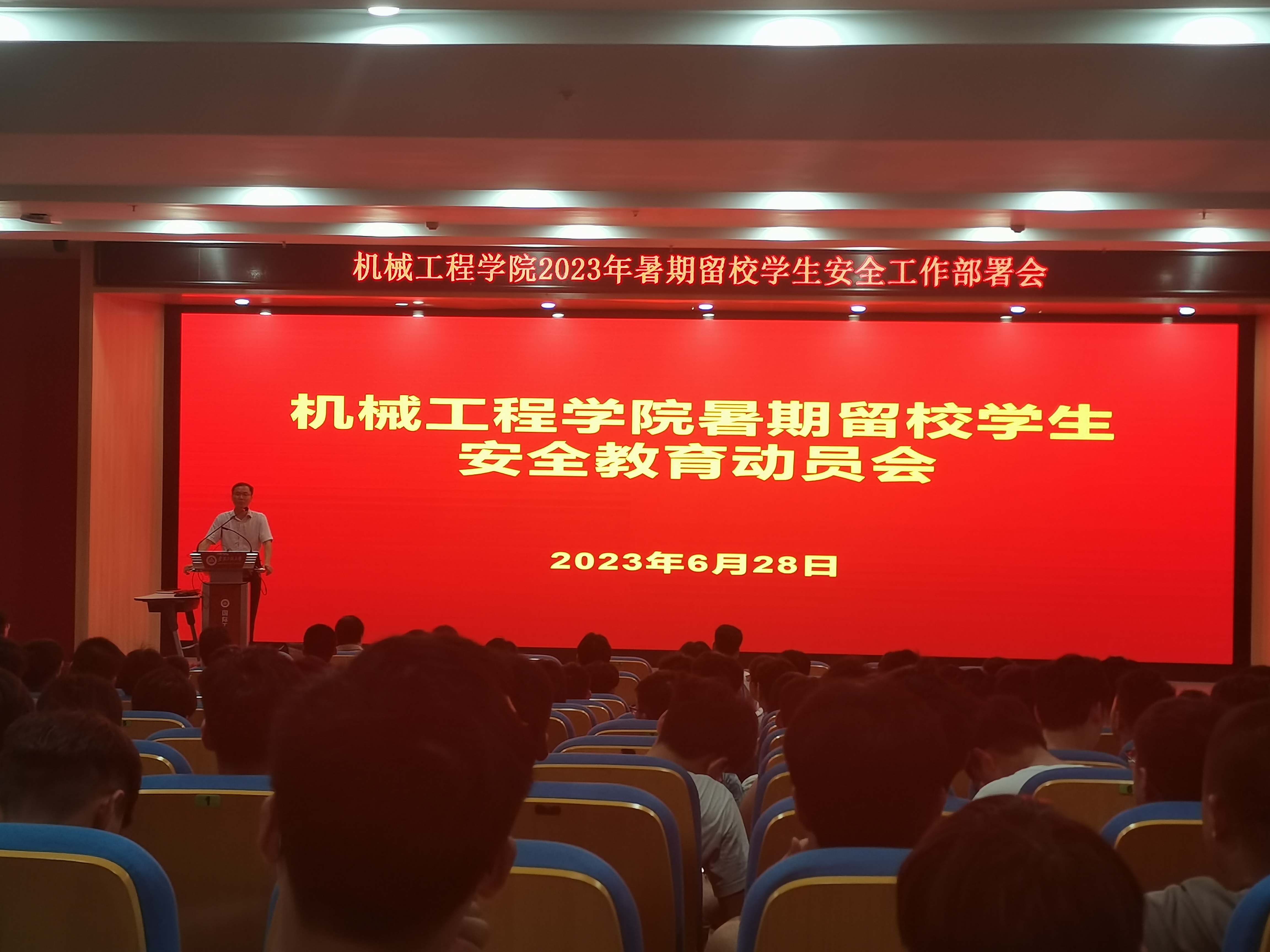 6月28日,机械工程学院在两校区针对本科生和研究生分别召开暑期留校学生安全教育大会,院长王建平、院党委副书记秦广虎、副院长潘家保、专业老师代表、全体辅导员和暑期留校学生参加会议。