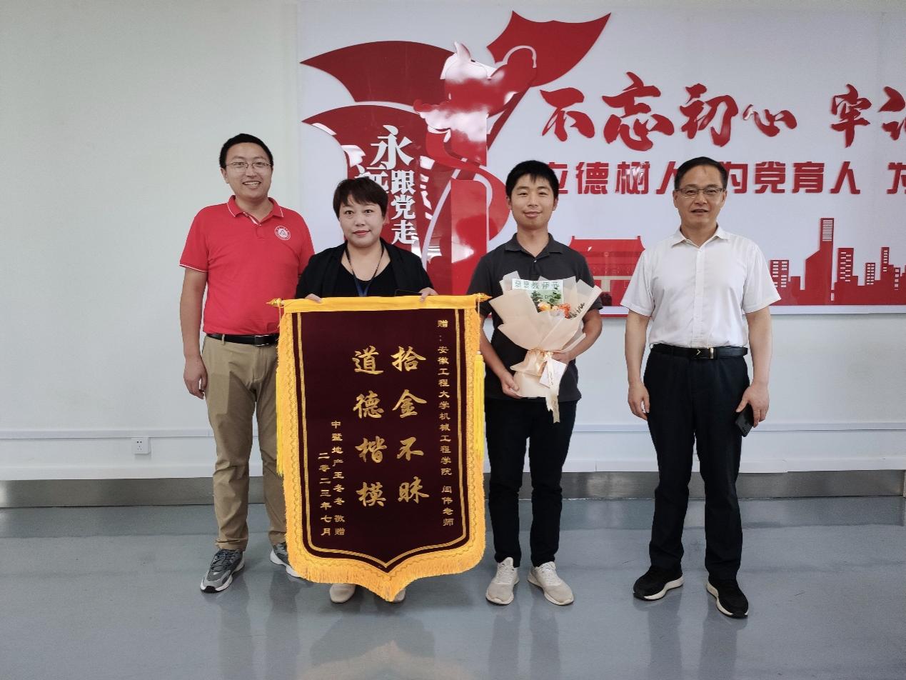 9月5日,校外王女士将一面写有“拾金不昧、道德楷模”的锦旗送到机械工程学院青年教师闫伟手中,对闫伟捡到王女士丢失的重要文件、帮助其挽回损失表示感谢,并称赞百合漫画 老师品德高尚。