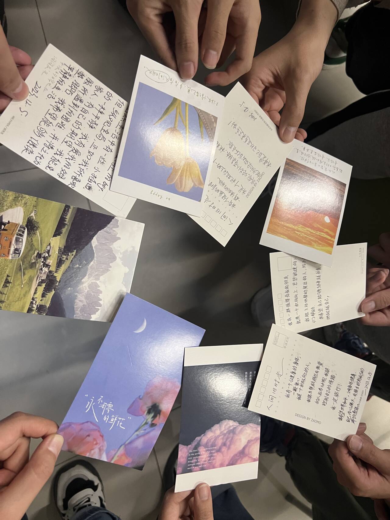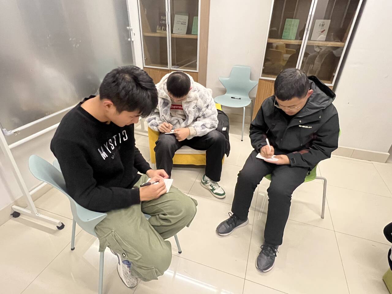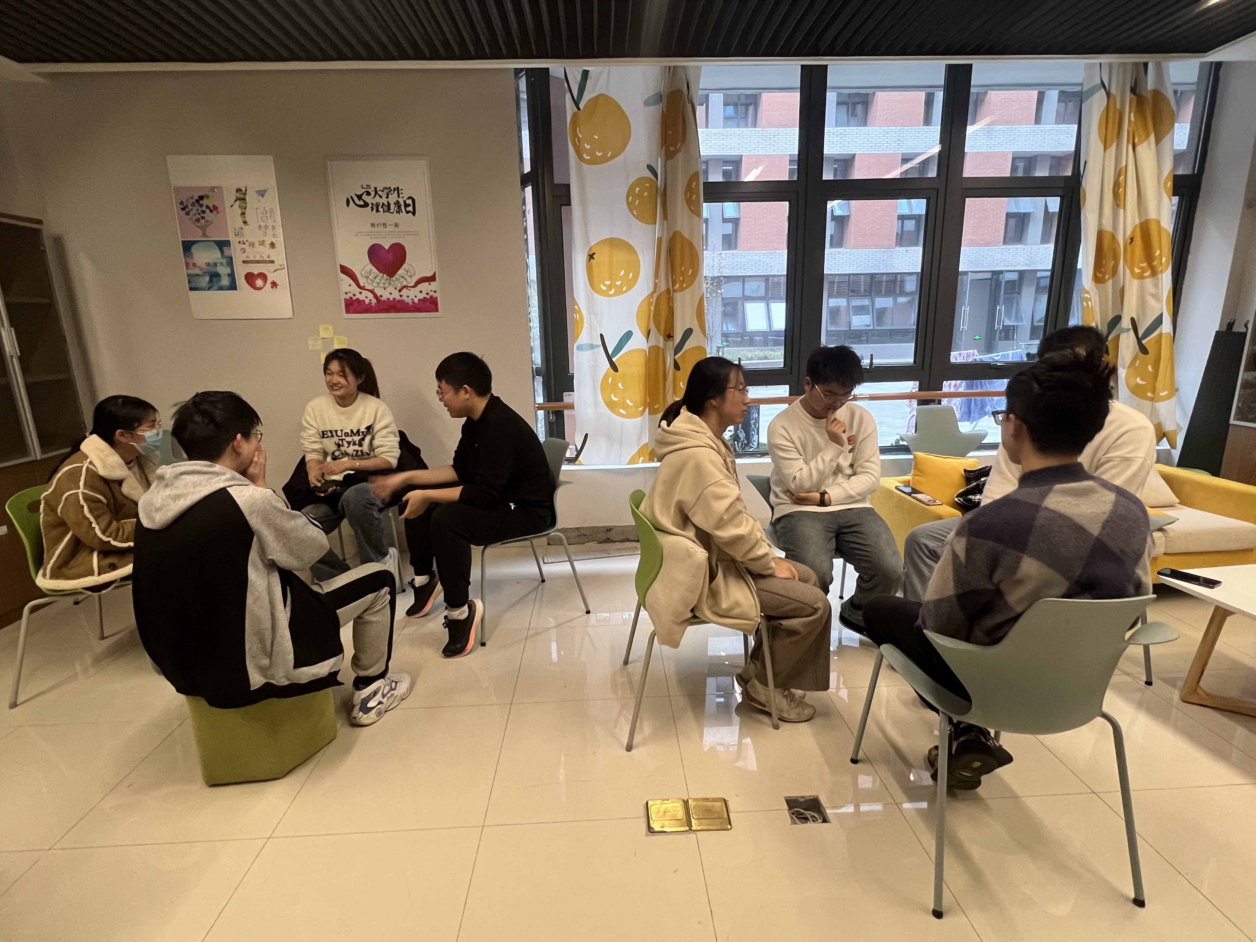 活动伊始,钱圆圆向同学们介绍了活动规则和内容,简单的分组和自我介绍过后便进入了破冰小游戏之“桃花朵朵开”环节,以拉进团队成员距离,帮助同学们体验情绪。在“你比我猜”游戏环节,同学们先分组从题库中抽取比划内容,提前确定好表演人员和猜题人员,然后通过肢体加语言的方式进行展示,伴随着各种各样的搞怪动作、五花八门的答案,现场气氛逐渐热烈,同学们在欢快的氛围中逐渐拉进距离、放松心情。游戏结束后,钱圆圆鼓励大家开展讨论,就近期产生的积极或消极情绪以及不同情绪带来的影响、如何消除负面情绪进行分享,过程中,同学们互相共情倾听,真诚分享美食、运动、旅游、读书等疗愈方法。在“我有、我能、我是、我希望”活动环节,钱圆圆引导同学们在明信片写下“我有什么”“我是什么”“我能做什么”“我希望什么”四个问题的答案以及对自己和彼此的祝福和希望,以帮助同学们建立积极自我意象。
