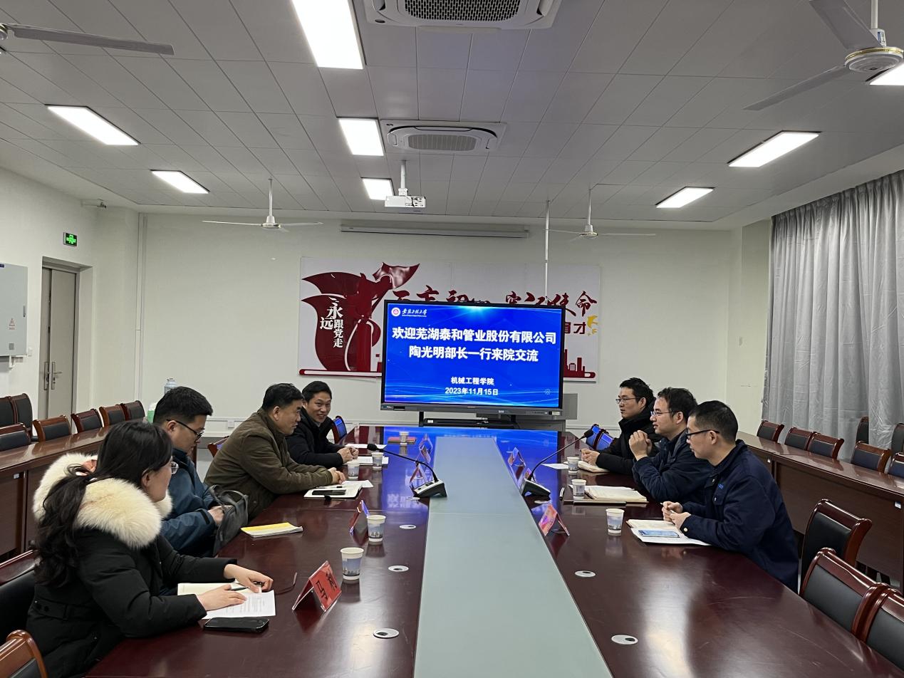 为充分发挥党建引领作用,高质量推动校企互联互动,巩固深化校企合作,围绕党支部“七个有力”建设标准,强化支部标准化规范化建设,积极发挥“双带头人”作用,12月15日,应机械工程学院邀请,芜湖泰和管业股份有限公司副总经理陶光明一行来机械工程学院洽谈产教融合合作事宜。机械工程学院院长王建平,副院长、安徽省首批“双带头人”教师党支部书记工作室负责人王建彬及教师代表参加会议。会议由王建彬主持。