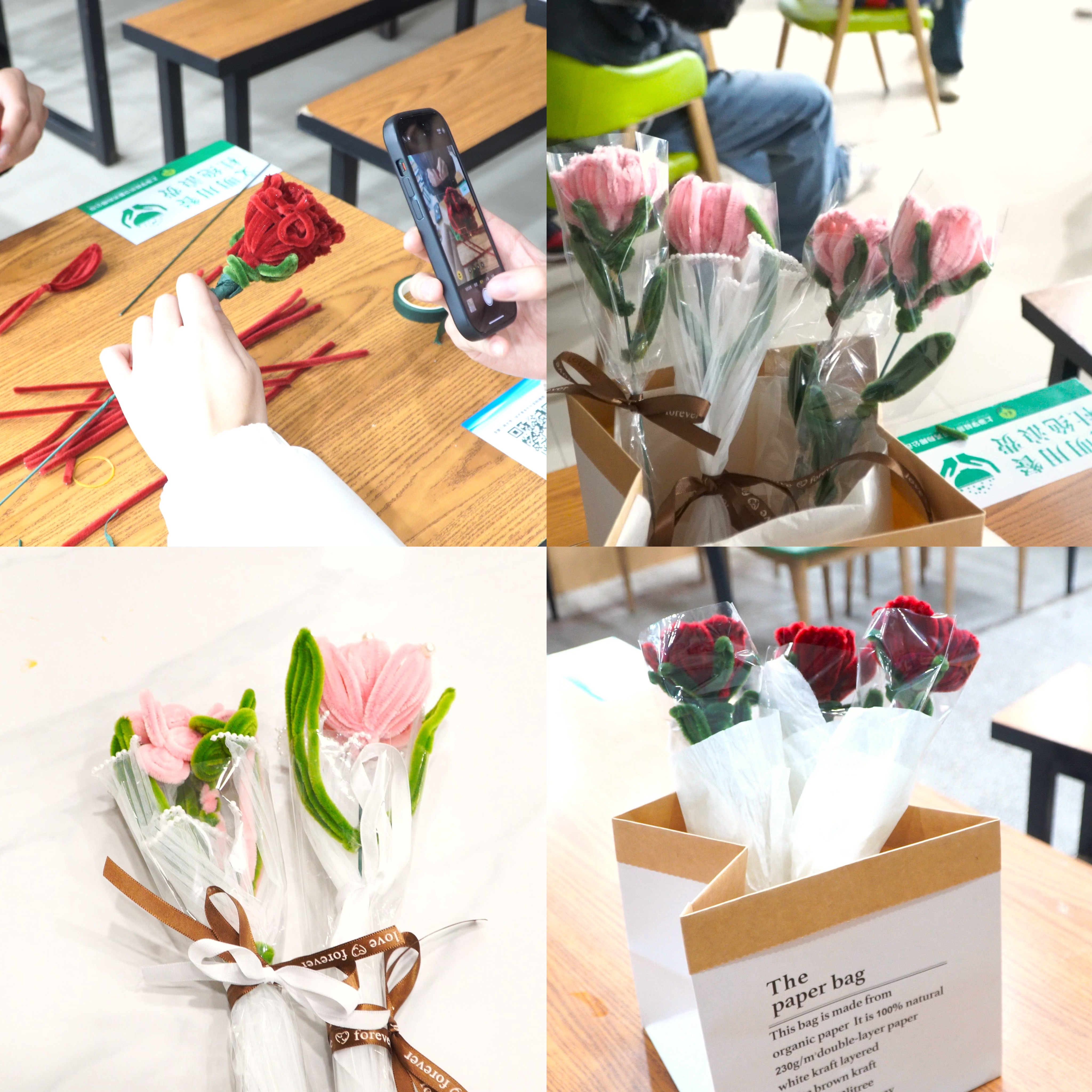 活动采用制作手工扭扭捧花的方式进行,经过前期宣传,共吸引了50余名学生参加。为了确保活动顺利进行,学院精心准备了足够的酒红玫瑰、粉红郁金香、樱桃粉玫瑰三种花的制作原料及必需工具。活动现场,参与同学跃跃欲试,结合网络教程视频和自身经验,手脑并用、专心制作,积极交流、气氛热烈,经过2个小时的不懈努力,一朵朵美丽的花便呈现在大家面前。车辆201郭晟晟表示,此次活动有趣、有料、有意义,我们可以从中感受到做手工的快乐,也可以通过团结协作增进同学间的感情。