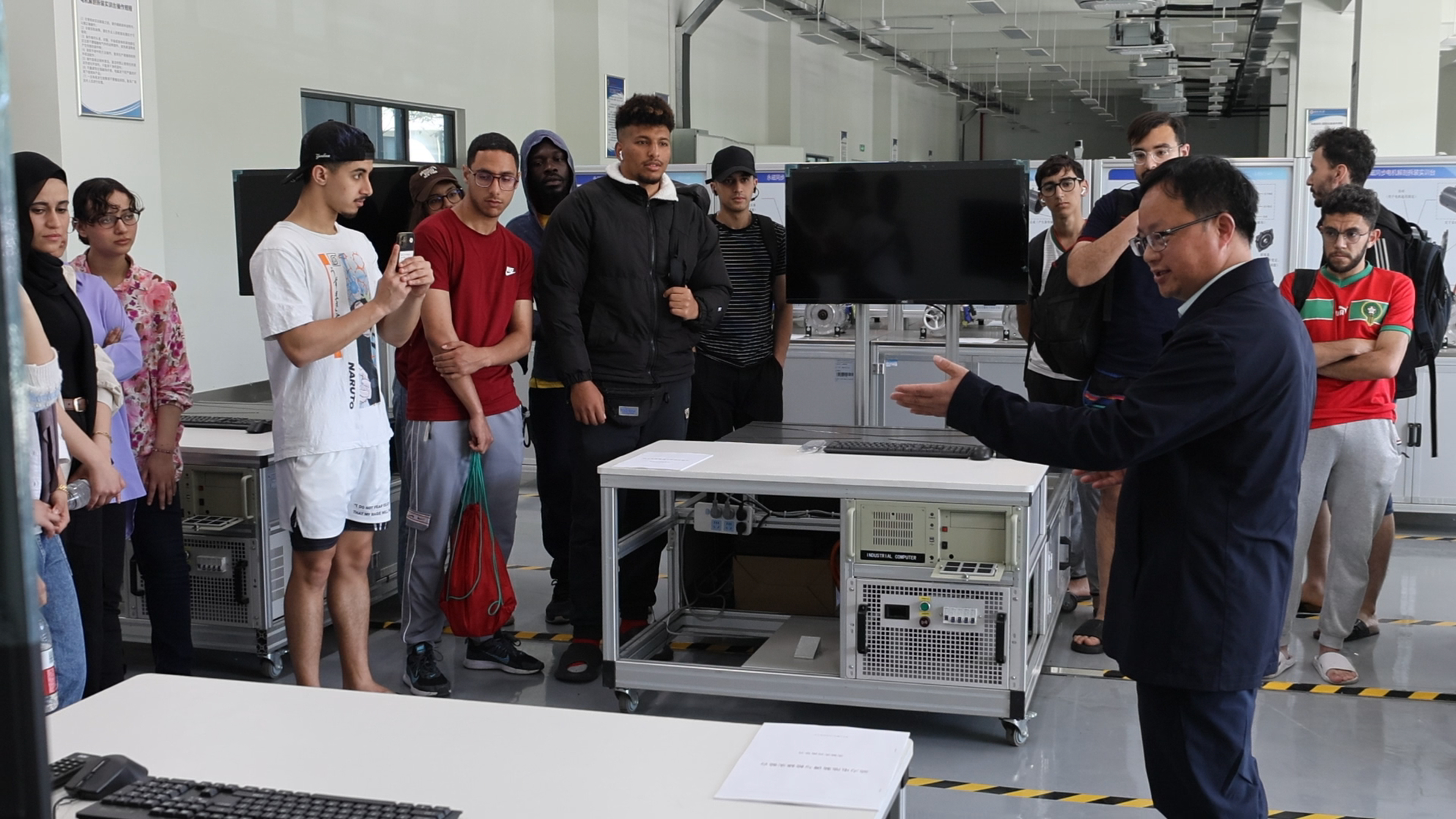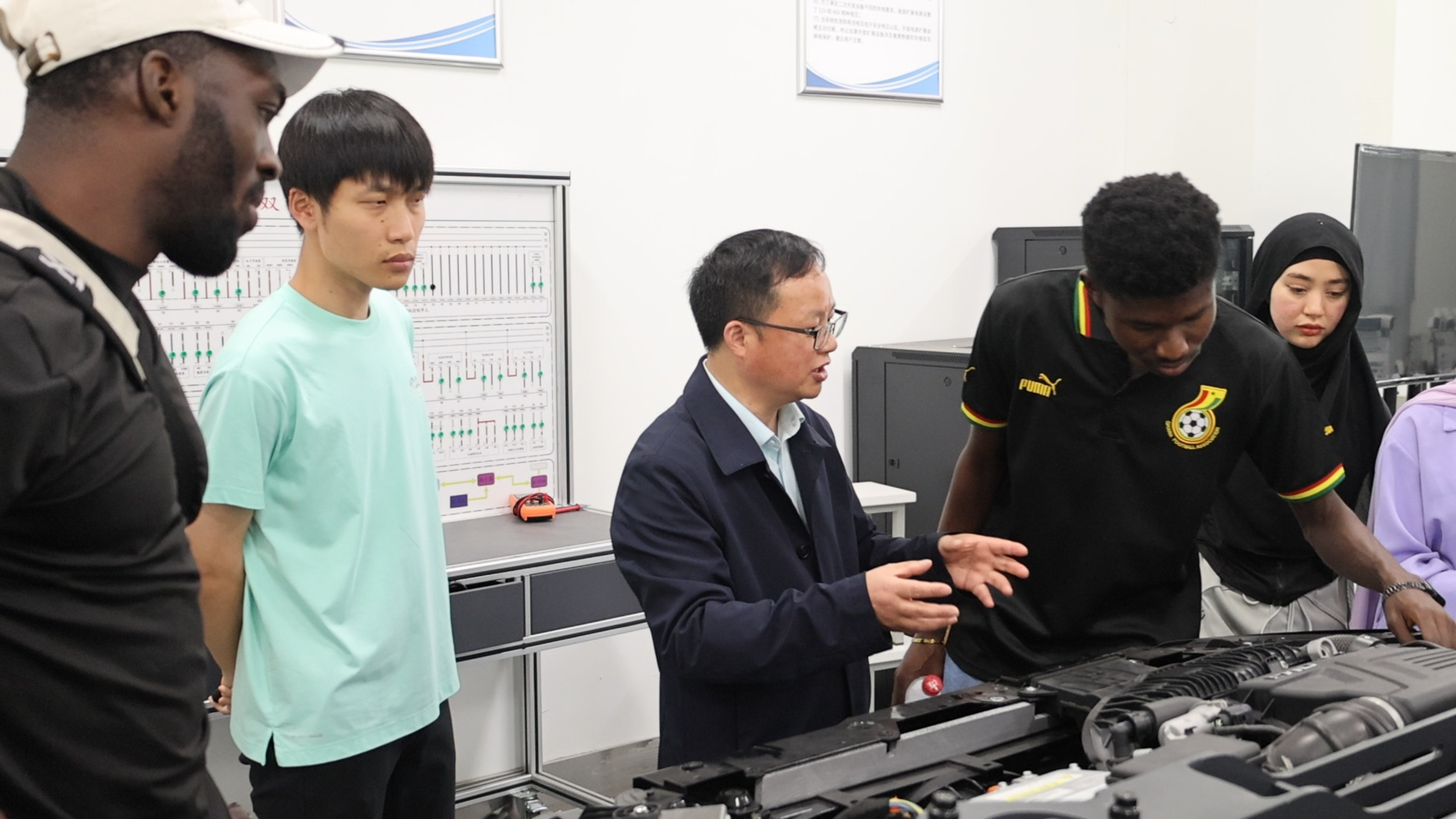 肖平带领留学生们逐一参观了学院相关实验室,并就车辆实验器材、汽车装备技术、新能源汽车、我国汽车产业发展、人才培养等方面进行详细讲解。留学生们认真听取肖平的讲解,积极参与交流互动,并观看了学生汽车实践操作课程。