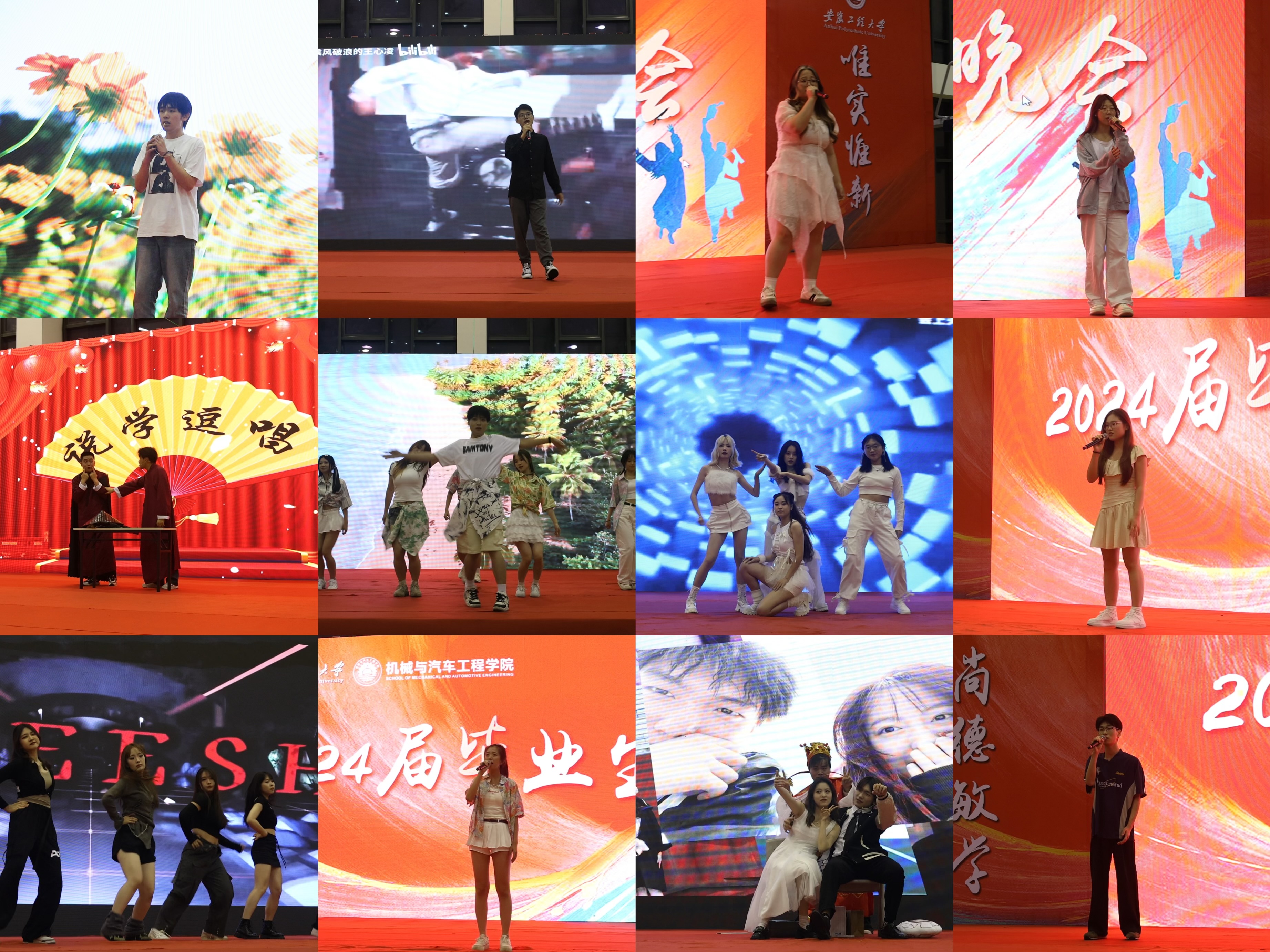 晚会开始前,毕业生们纷纷在屏幕上留下祝福弹幕,时而深情、时而搞笑。随着伴奏响起,舞姿优美、歌曲欢快的宅舞《寄明月》吸引住了全场目光,随后,相声《我的江湖》、歌曲《晴天》《真心英雄》《凤凰花开的路口》《Forever young》《日不落》《寻一个天荒地老的地方》、舞蹈《diamond》《sheesh》《dreamscometrue》、小品《想说的话》陆续登场,台上演员们精心演绎、各展风采,充满了青春的活力与热情,引得现场观众笑声连连、掌声不断。