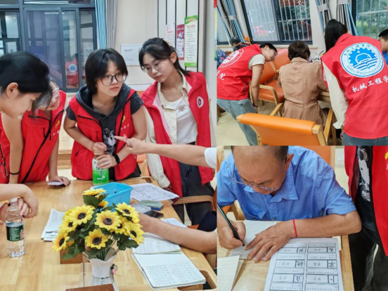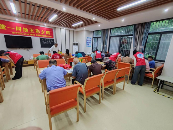 志愿者们走进社区医养中心,组织了一场“银龄课堂——同绘五彩夕阳”的老年教育活动。在银龄教师刁汉杰老先生的生动课堂中,每一位学生认真听讲,就像是回到少年时期,好学、敢问。一停一顿,一笔一划,写好每一个字。团队成员在旁协助,帮助老人们认字写字,耐心辅导让老人们在轻松娱乐的氛围中掌握认字技能。