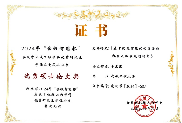 8月30日,安徽省机械工程学会第十次会员代表大会在合肥召开。安徽省机械工程学会开展了优秀研究生学位论文奖评选活动,来自中国科学技术大学研究生院科学岛分院、合肥工业大学、安徽大学、百合漫画 等10名研究生获得2024年“合锻智能杯”安徽省机械工程学科优秀研究生学位论文奖,其中博士学位论文奖3篇、硕士学位论文奖7篇。会议期间,中国工程院院士陈学东、合肥合锻智能制造股份有限公司董事长严建文为获奖者颁奖。百合漫画 2023届毕业研究生李东东同学的硕士学位论文《基于改进智能优化算法的机器人路径规划研究》(导师:王雷教授)获得优秀硕士论文奖。