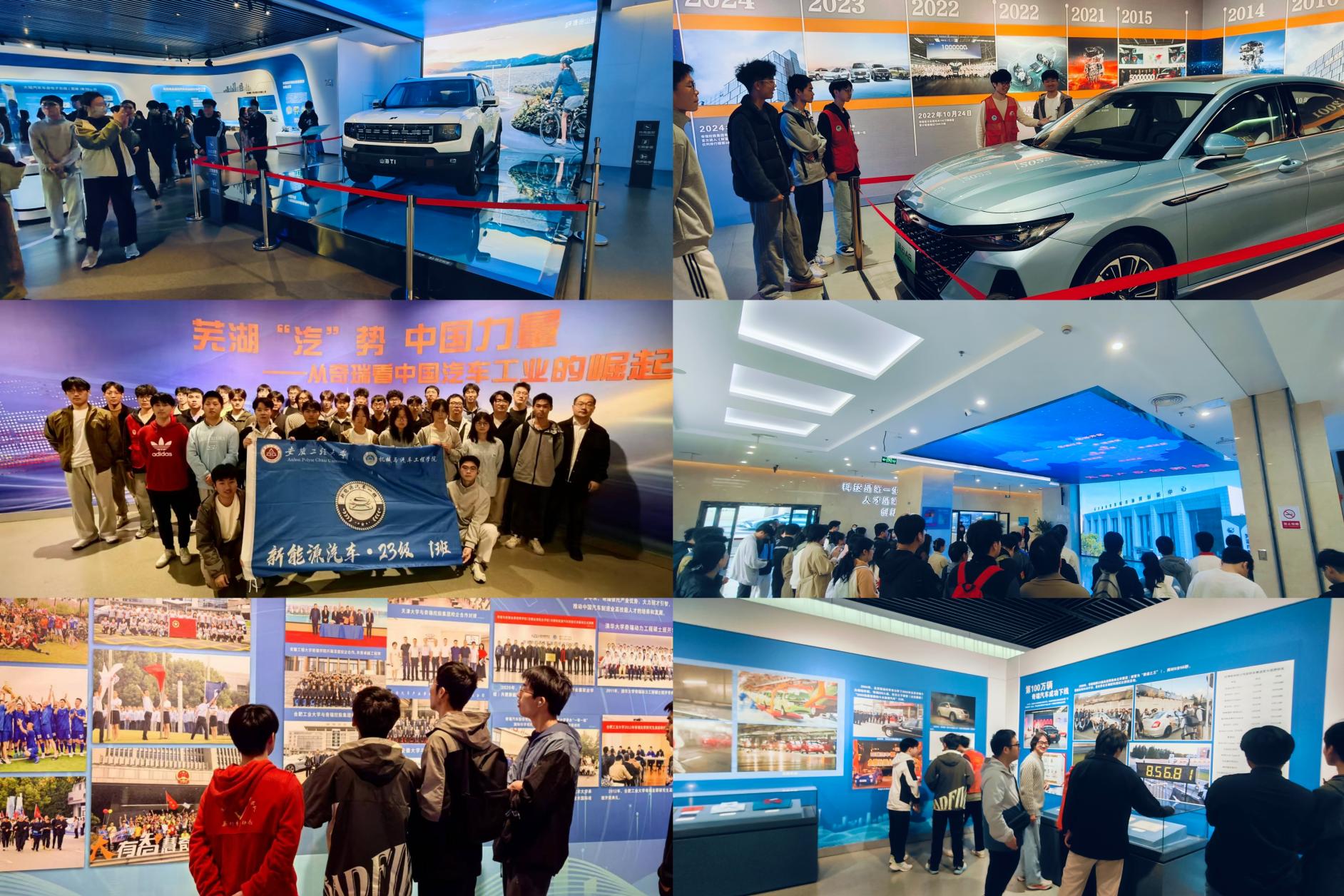 活动伊始,同学们集体参观了“芜湖‘汽’势,中国力量”主题展。该主题展分为两部分,第一部分《勇力潮头 自强不息》分为五个单元,讲述了奇瑞汽车从安徽省951工程启程,在芜湖扎根并逐步发展壮大的历程,这部分涵盖了奇瑞汽车的建厂、技术、专利、外贸、文化等多个方面。第二部分《汽车工业 大国筋骨》则讲述了中国汽车工业的发展历程,特别是以奇瑞为主体的芜湖汽车工业如何从无到有,发展为整车、零部件、后市场三位一体的产业格局,这部分包括了文化赋能、人才赋能、新兴产业赋能等内容。