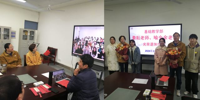 与会人员为喻全余老师和秦耘老师送上精美纪念品。两位老师同基础教学部青年教师进行座谈时嘱咐青年教师:要深耕教学,精耕教研,脚踏实地、站稳讲台、锐意进取,不断取得新成绩,也祝福学院发展越来越好。魏长顺代表学院对两位老师从教以来取得的个人成就给予充分赞许,为学院发展的辛苦付出表示衷心感谢,对他们的退休生活送上美好祝愿。
