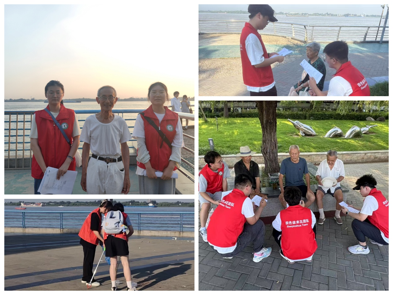 四色依米花实践团队赴芜湖长江沿岸和二坝镇乡村,开展了一场别开生面的环保实践之旅。在滨江公园、十里江湾景区,团队成员手持工具清理沿岸垃圾,向市民宣讲水域保护知识;深入二坝镇田间地头和村落农舍,调研农业生态现状,与村委会交谈,记录乡村绿色发展第一线的真实声音。团队成员用脚步丈量母亲河岸线,清理江滩,收集多份生态问卷,将青春汗水挥洒在建设美丽中国的生动实践中。