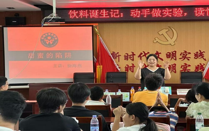 717日,“警惕甜蜜陷阱”主题讲座上,志愿者以常见饮料为切入点,现场演示“DIY 网红饮料”,揭示添加剂的“伪装”;通过实物对比,直观展示“一瓶奶茶≈10 块方糖”,让大家深刻认识到高糖饮品的危害,引导树立科学饮食理念。