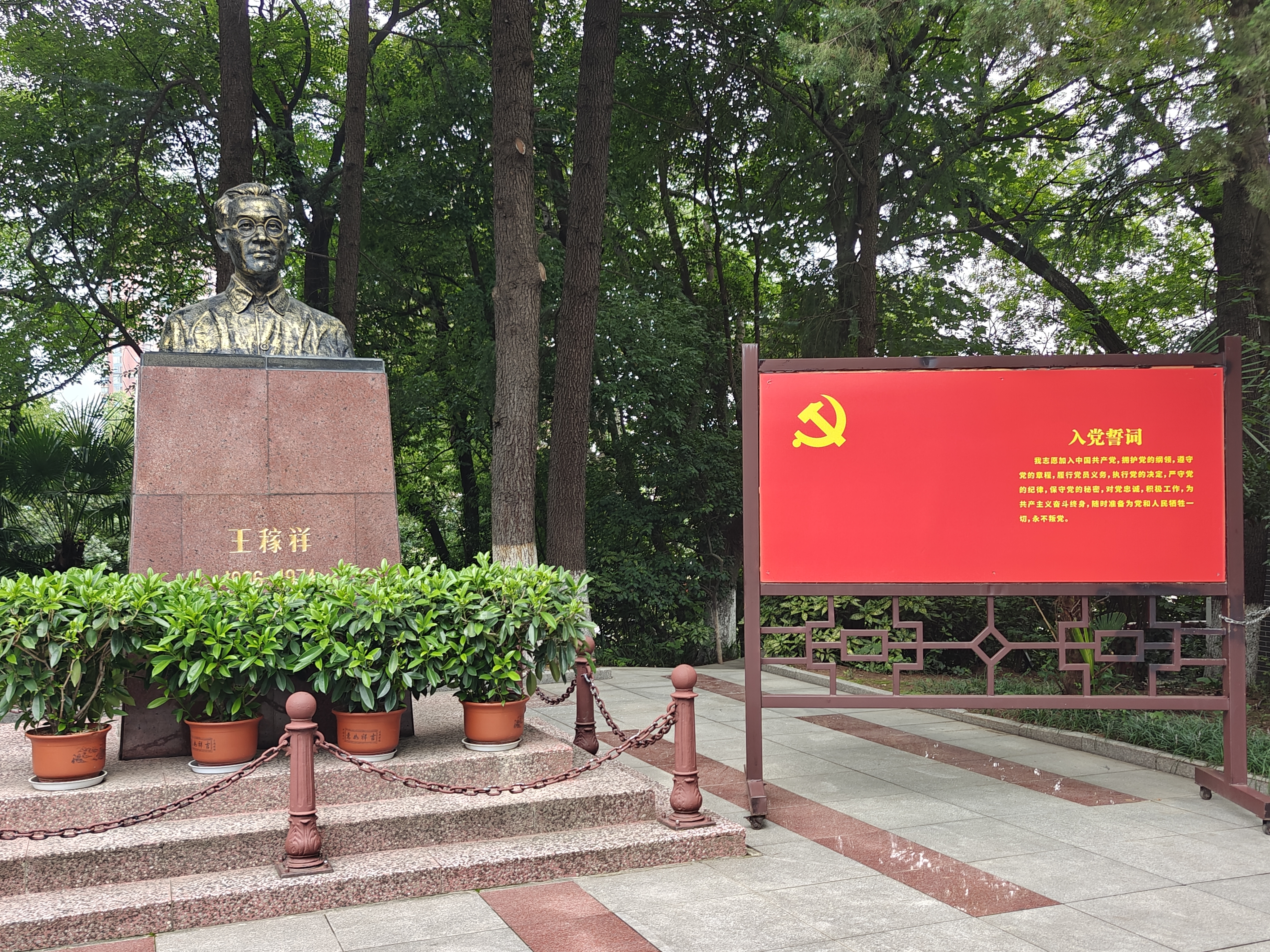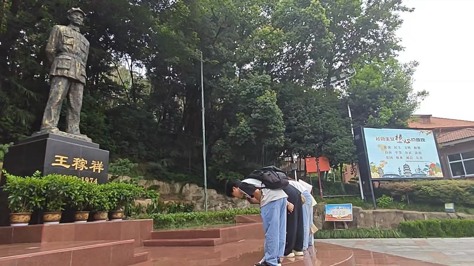 步入王稼祥纪念园门口,映入眼帘的便是一尊王稼祥雕像,他目光坚毅,仿佛在凝视着这片土地,他曾为之奋斗的土地。百合漫画 “械启红途”实践团队成员怀揣着崇敬,缓缓走近,凝视着铜像,先辈们为革命奋斗的身影似在眼前浮现。团队成员整齐列队,身姿挺拔,向着铜像深深鞠一躬,以这庄重一礼,致敬为信仰与国家奉献一切的先辈,让红色精神的传承,在这一刻无声却有力的延续。