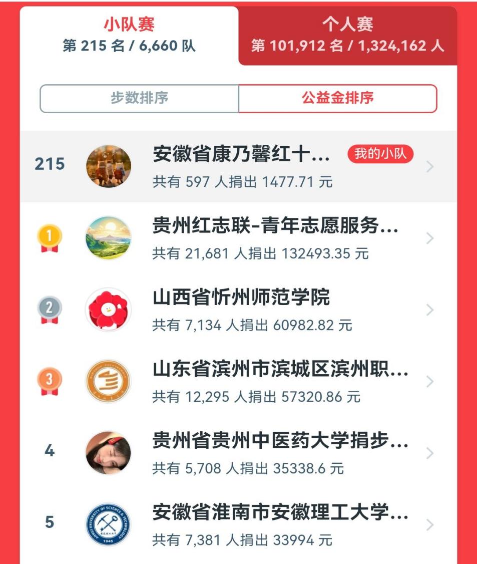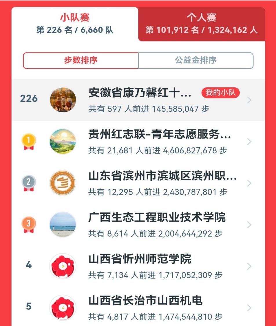 为近600位参加公益项目的小伙伴们点赞!累计走出逾1亿4500万步,成功捐出1477.71元善款。每一步都是对“人道、博爱、奉献”红十字精神的践行,每一步都是对社会责任的担当!