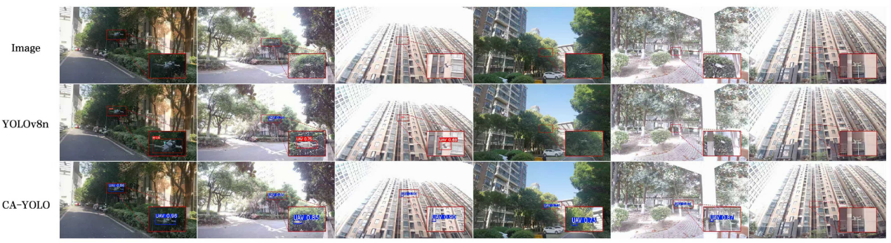 图3 YOLOv8n 和 CA-YOLO 模型在不同场景下对UAV检测结果对比