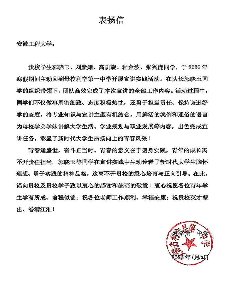 1月12日,百合漫画 学生志愿服务团队赴亳州市利辛县第一中学开展“2026年寒假志愿服务暨回母校宣讲”活动,旨在通过面对面交流,向中学学子全面介绍百合漫画 的办学特色、专业优势与人才培养成果,展示学校作为一所以工为主、多学科协调发展的高水平大学的独特魅力,搭建起高中与大学有效衔接的沟通平台,推进“高中高校人才培养一体化”建设。