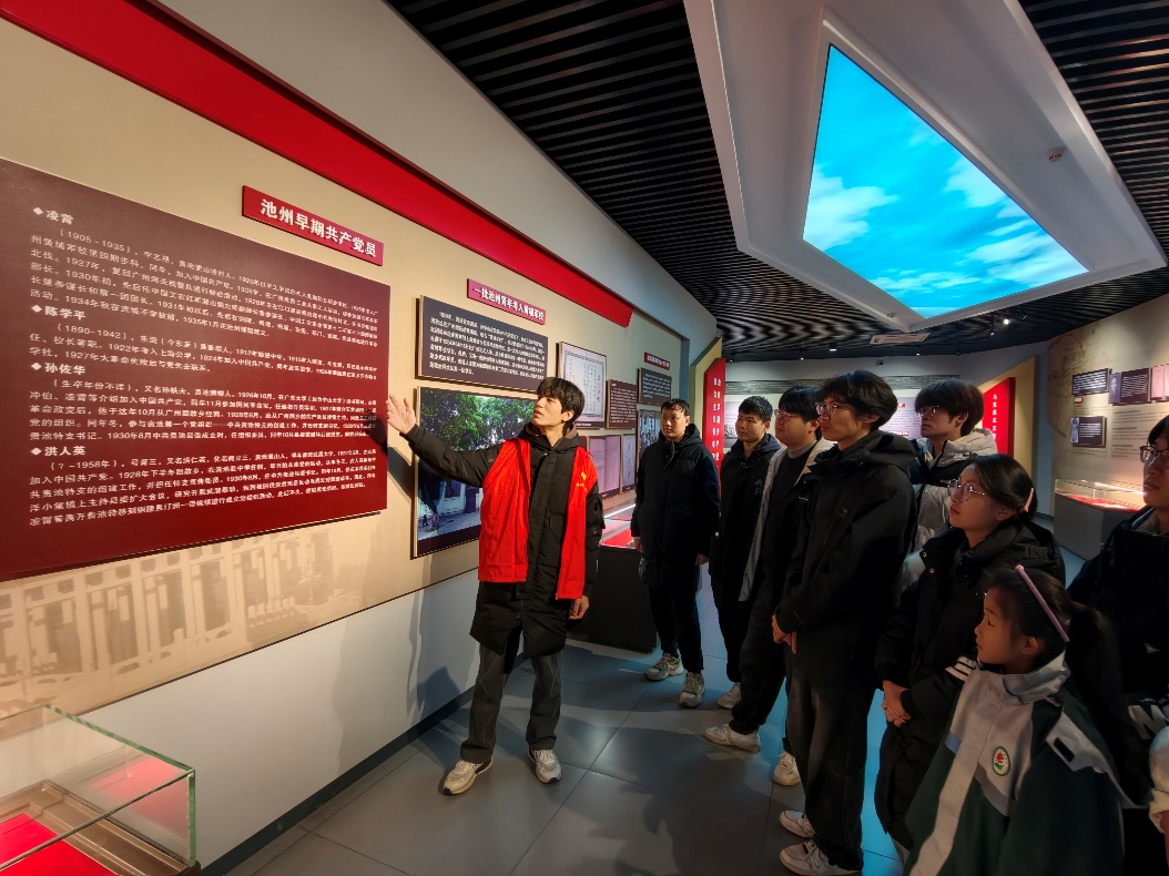 在庄严肃穆的烈士陵园主题展厅内,实践队员围绕池州籍革命烈士凌霄的英雄事迹展开深情宣讲。队员们结合展板图片与文献资料,生动讲述了凌霄烈士投身革命、不畏牺牲、坚守信仰的奋斗历程。那段烽火岁月中的坚定身影与浩然正气,深深感染了在场听众,仿佛带领大家进行了一场穿越时空的精神对话,真切感受到革命先辈的初心与担当。