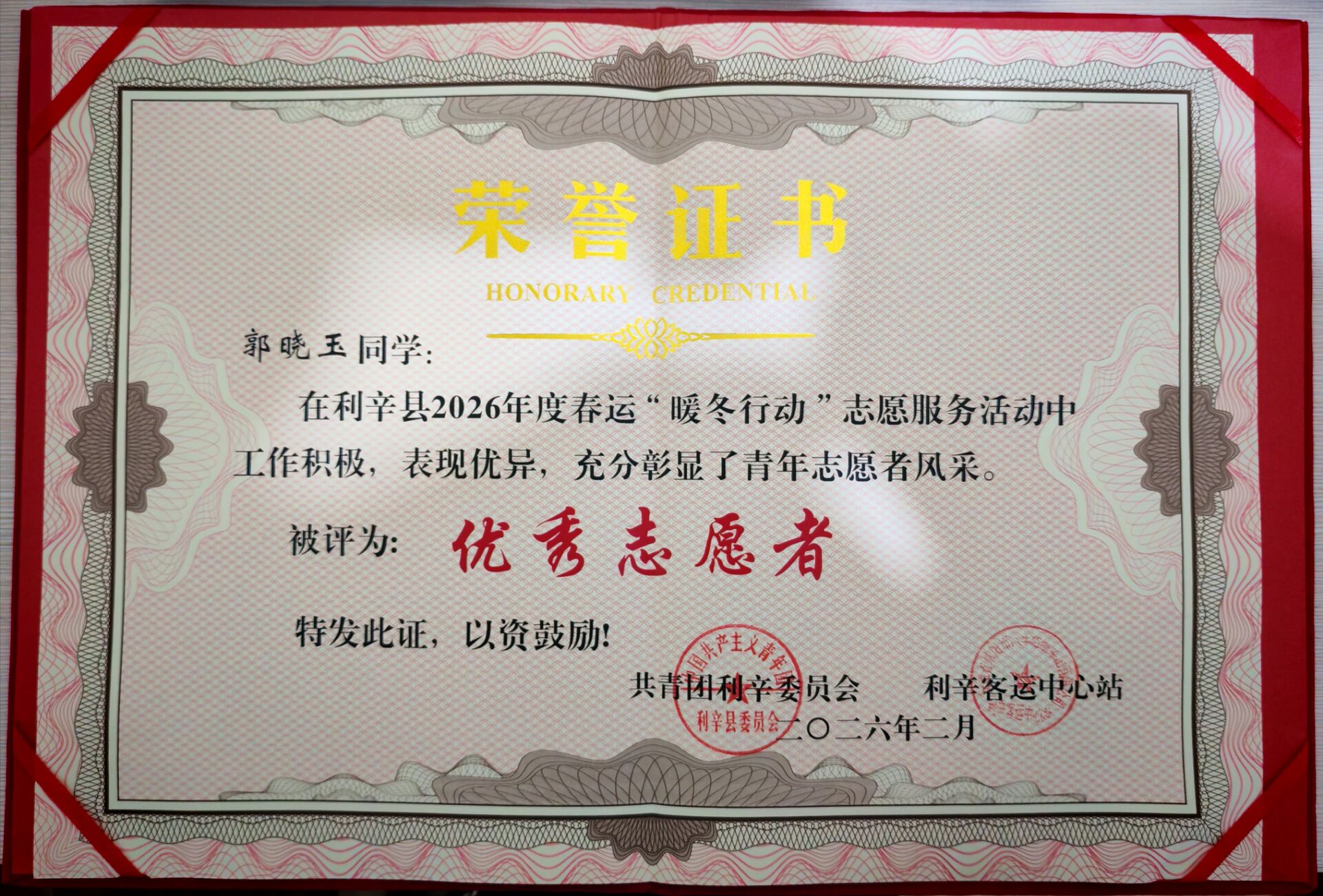 活动期间,机械学院志愿者们坚守在利辛县春运各服务岗位,协助车站工作人员开展引导咨询、行李搬运、秩序维护、票务协助、便民帮扶等多项工作。他们耐心解答旅客疑问,贴心帮助老弱病残孕等重点旅客顺利出行,及时化解各类出行难题,有效缓解了春运客流压力。在科技日新月异的今天,面对不熟悉电子设备、需要人工窗口或志愿者协助购票的老年旅客,志愿者们总是不厌其烦地手把手教导他们使用手机APP购票,帮助老人们跨越“数字鸿沟”。看到旅客在候车间隙等待,志愿者们还会主动递上一杯热水,用温暖驱散冬日寒意,并送上真挚的旅途祝福。面对繁忙客流与复杂需求,机械学院志愿者们始终保持着耐心细致、认真负责的态度,以规范的服务、温暖的微笑赢得旅客和车站工作人员的一致好评。凭借在春运志愿服务中的出色表现与突出贡献,郭晓玉同学在本次“暖冬行动”的总结表彰中荣获“优秀志愿者”称号,并获颁荣誉证书。