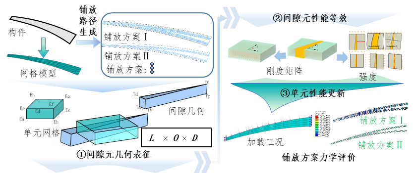 研究团队开发的间隙体积元模型能够将自动铺丝路径规划信息直接映射至结构有限元网格中,综合考量间隙面积、空间位置及铺放角度偏差等因素,构建了从制造路径到结构力学性能的跨尺度联系。验证结果表明,该模型对含三角形间隙试样力学响应的预测与实验数据高度吻合。在此基础上,团队进一步构建了复合材料结构力学性能的快速评估框架。评估结果揭示:间隙的空间分布方式会显著影响壁板的承载能力;相比于厚度方向上间隙缺陷的重叠分布,层间交错分布方案能赋予结构更优的力学性能。