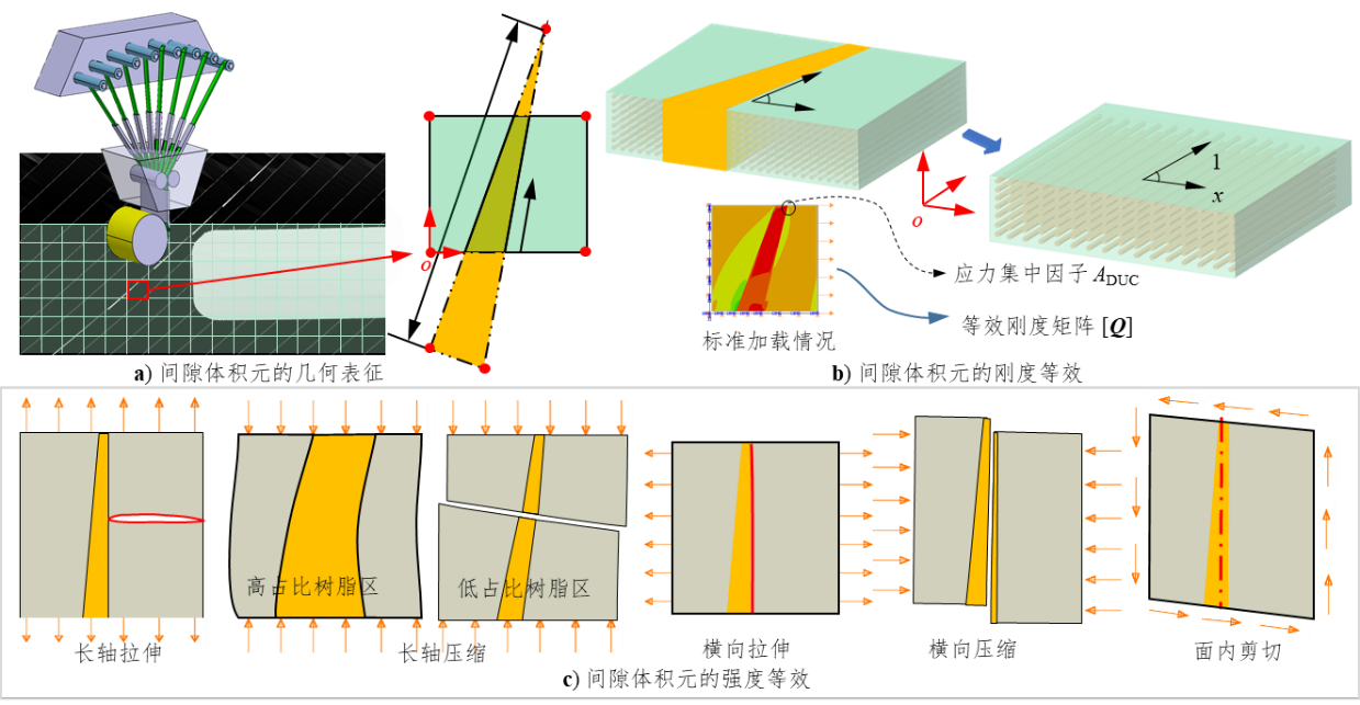 针对大型自动铺放(AFP)复合材料结构中因丝束间隙缺陷导致的力学性能跨尺度预测难题,陈启森博士提出了一种基于间隙体积元(GVE)的均质化模型及顺序多尺度评估框架。该模型成功将介观尺度的间隙特征映射到宏观结构响应中,高效评估了不同间隙分布方案对壁板承载力的影响,为自动铺放复合材料结构的快速设计迭代、可制造评价与缺陷容限分析提供了重要支撑。