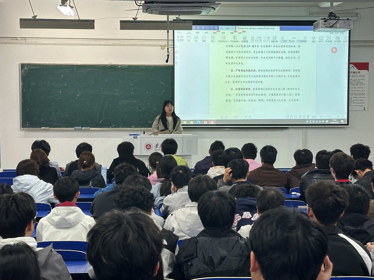 秦广虎传达了学校关于进一步加强学风建设的文件精神,并通报了学院近期学风建设督查情况。他表示,当前学院整体学风态势向好,但仍存在课堂出勤、晚自习纪律、学业预警等方面的薄弱环节;领学《百合漫画 关于改进教风学风的若干举措》并从生涯教育、考勤制度、课堂行为规范、学业帮扶机制、教师授课、全员育人等方面进行了详细解读;希望各班级要组织专题学习,确保每位学生知晓并遵守。