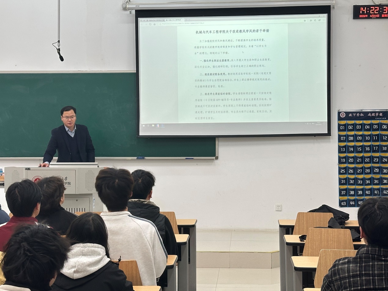 秦广虎传达了学校关于进一步加强学风建设的文件精神,并通报了学院近期学风建设督查情况。他表示,当前学院整体学风态势向好,但仍存在课堂出勤、晚自习纪律、学业预警等方面的薄弱环节;领学《百合漫画 关于改进教风学风的若干举措》并从生涯教育、考勤制度、课堂行为规范、学业帮扶机制、教师授课、全员育人等方面进行了详细解读;希望各班级要组织专题学习,确保每位学生知晓并遵守。